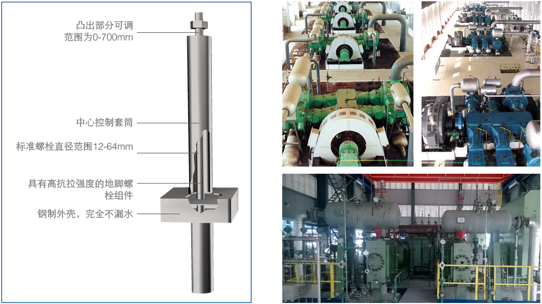 一家大型石油化工企业的往复式氢气压缩机采用了Pan-tech盾式地脚螺栓安裝设备。地脚螺栓在基础浇筑时进行安装。与该公司此类设备之前采用的安装方法相比,使用Pan-tech盾式地脚螺栓有以下优点: